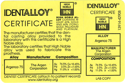 Argen 75% of gold are high noble gold services for full cast crowns, bridges, inlays and onlays.
